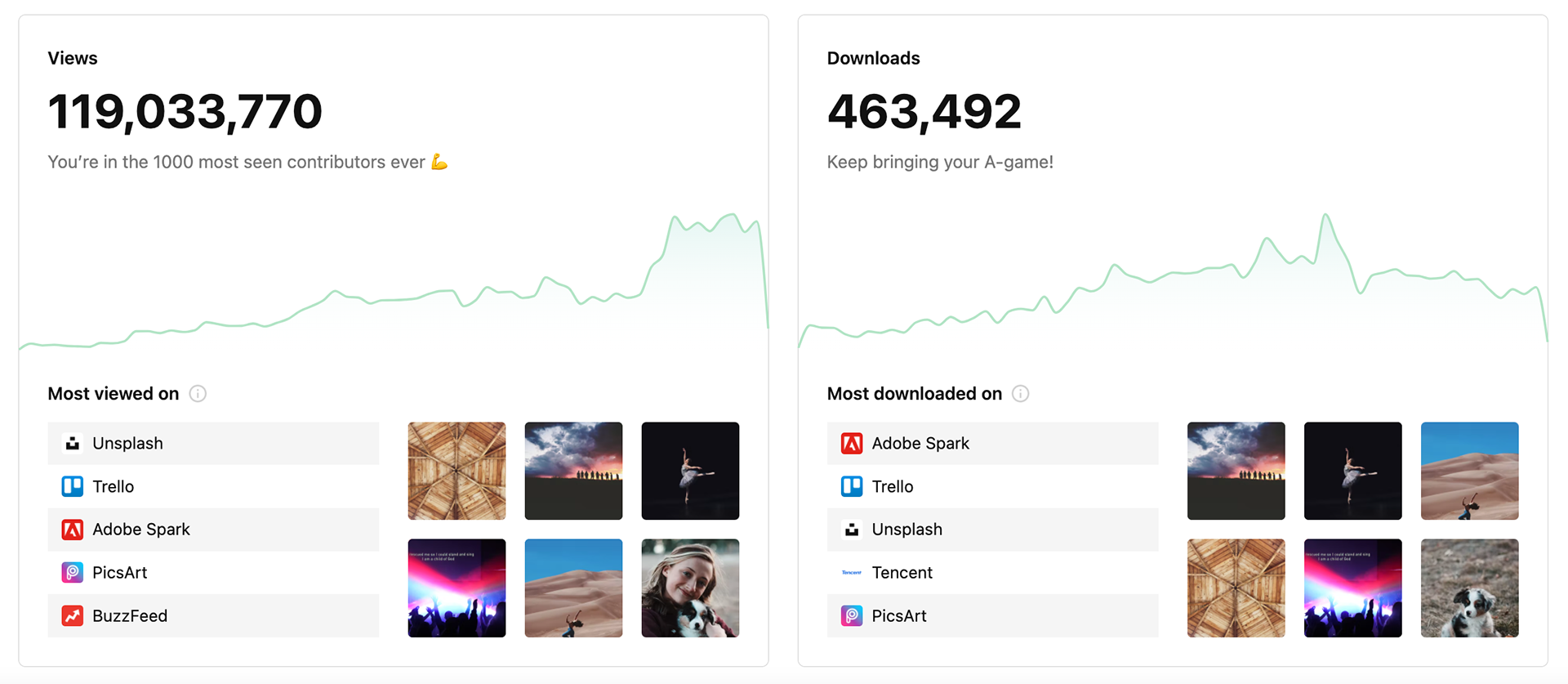 Over 100 Million views on Unsplash, near 500,000 downloads.